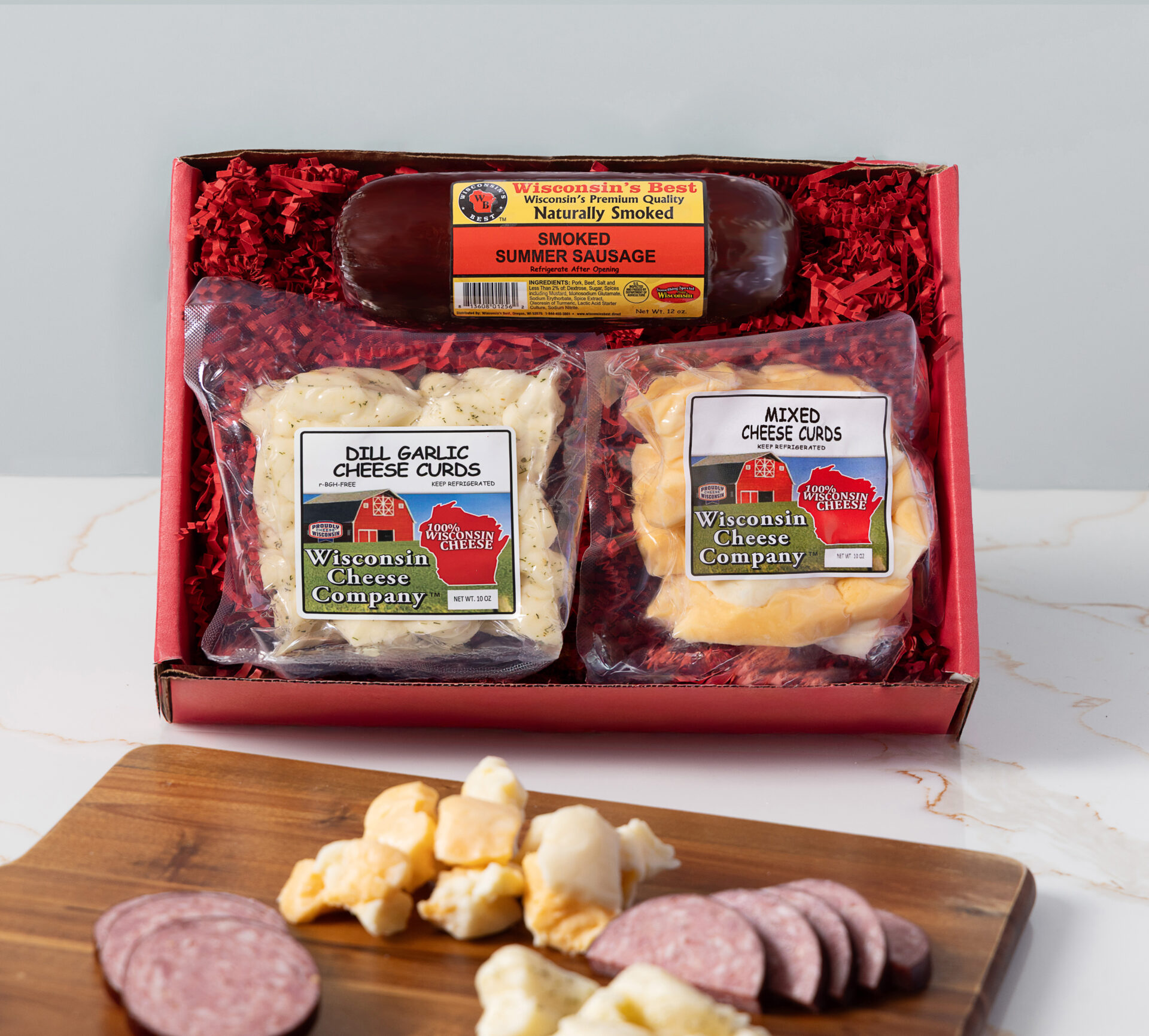 This handcrafted gift box features two 10 oz. bags of 100% real Wisconsin cheese curds, including smooth Mixed Cheese Curds and savory Dill Garlic Cheese Curds, paired with a 12 oz. Naturally Smoked Summer Sausage made for easy slicing and sharing. Together, they deliver balanced flavor, satisfying texture, and that unmistakable taste of America’s Dairyland.